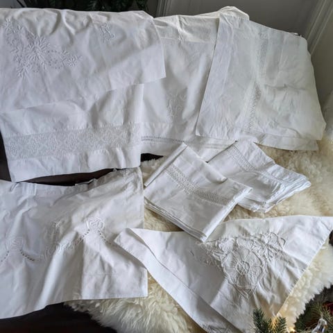 Nydelig, eldre rosa og hvitrutet duk i lin. Alle annonser: 3 for 2.