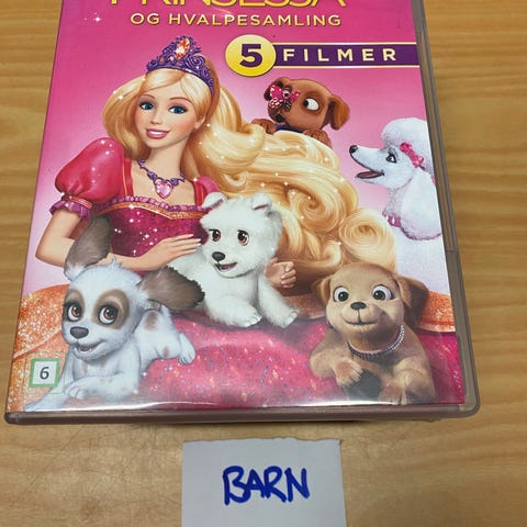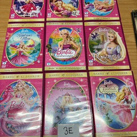 Samling av Barbie DVD-filmer med forskjellige eventyr og temaer. Passer for barn som liker animasjonsfilmer med prinsesser, magi og fantasy-elementer.