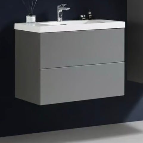 Baderomsmøbelsett bestående av vegghengt skap med skuffer og servant i hvit utførelse. Speil med integrert belysning. Møblene er designet for oppbevaring og funksjon i baderom. Materialer og størrelse er tilpasset standard baderomsbruk.