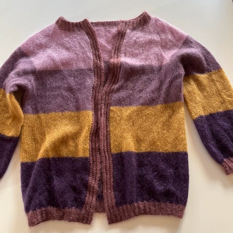 Den er strikket i kvalitetsgarn Silk Mohair fra Sandes Garn i freshe farger. Gardiganen er pent strikket og passformen er helt super. Jeg har droppet knappene fordi jeg synes den faller veldig fint foran uten knapper.