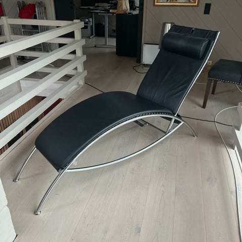 Stilig liggestol selges! Veldig behagelig å slappe av i. Svart imitert skinn som gjør det enkelt å vaske og holde ren. Den er. 50cm bred, 165 lang. 180cm i seteputen.