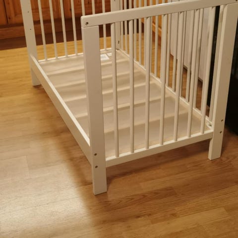IKEA Enkeltseng barneseng med stoffkledd ramme og treben. Egnet for barn, designet for enkeltsengbruk.