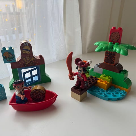 LEGO DUPLO lastebil med tilbehør, inkludert blå lastebil med gul tippfunksjon hus, spade, radio og flere brikker som vist på bildene. Egnet for små barn, laget i plast.