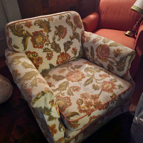 Stolen har tydelig bruksslitasje og noe nupper i stoffet, men er fortsatt fullt funksjonell. Passer fint som ekstrastol, på hytte, i kjellerstue eller studentbolig.