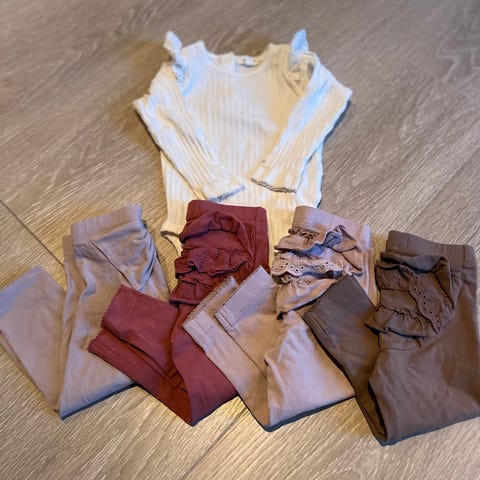 Newbie-pakke med 4 plagg. Bodyen er brukt litt mer enn den tilhørende leggingsen, og det er derfor litt fargeforskjell etter vask. Ikke sjenerende, kan brukes sammen eller hver for seg🥰