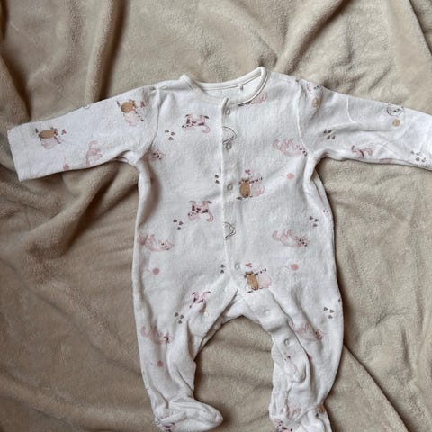 Name it hvit babyklær laget av bomull i størrelse 56 for jente. Plagget har lange ermer og ben, og inkluderer en hette. Passer for nyfødte og små babyer.