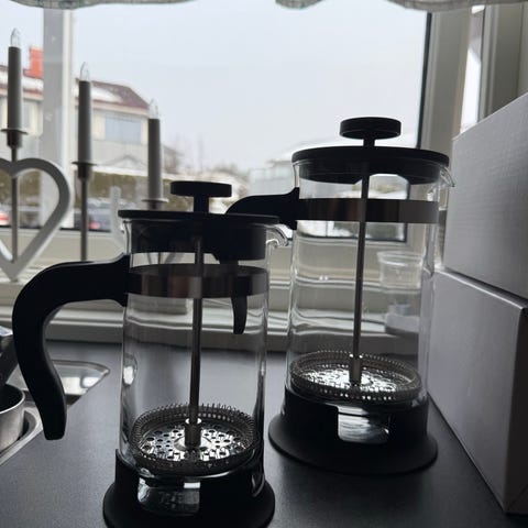Stor og praktisk presskanne fra IKEA. Laget av glass og svart plast.