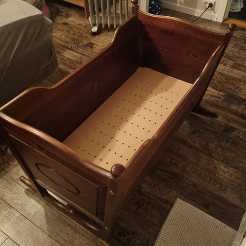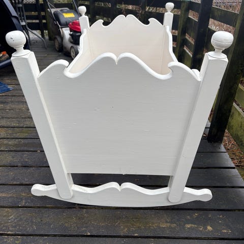 Babybay barneseng i hvit tre. Barnesengen er designet for barn og laget i tremateriale. Den har en klassisk stil med buede detaljer og er egnet for bruk i barnerom.