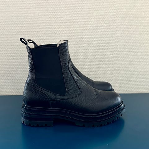 Tøffe, elegante og varme vinterboots i glatt, sort skinn. Skoene har grov såle, med glidelås på innsiden. Helforet med sort ull.