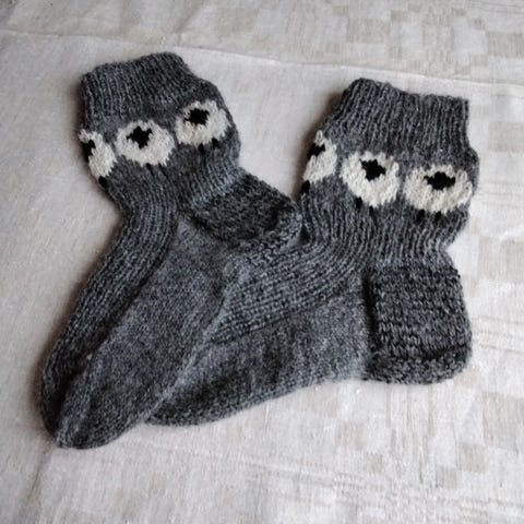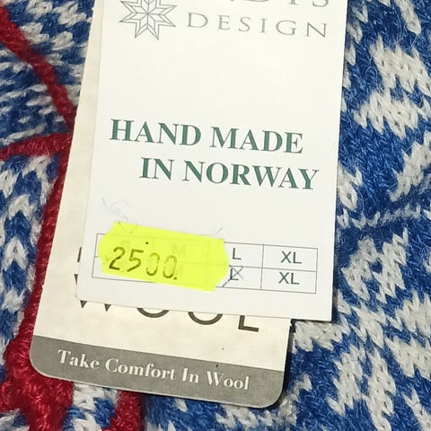 Uåpnet pakke med Tinde pelsullgarn I rødt og blått. Bundtene er 100g + 50g.