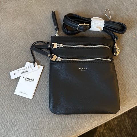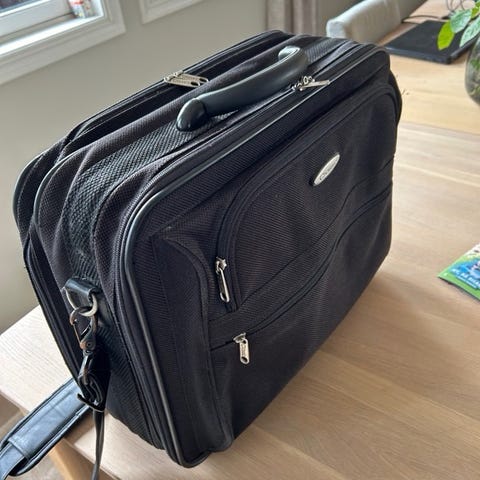 Svart vintage reiseveske fra 90 tallet (Toalettveske)med skulderrem som kan festes på koffert.Bredde 32 cm høyde 23 cm.