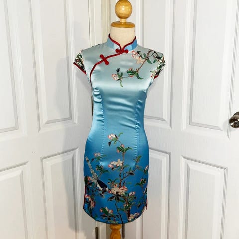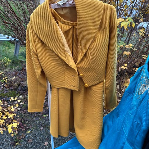 Vintage ballkjole fra 1950 tallet. Str ? 40-42? Lys blå med draperinger oventil og på skjørtet. Ikke brukt etter rensing. Renserilappen sitter fortsatt på.