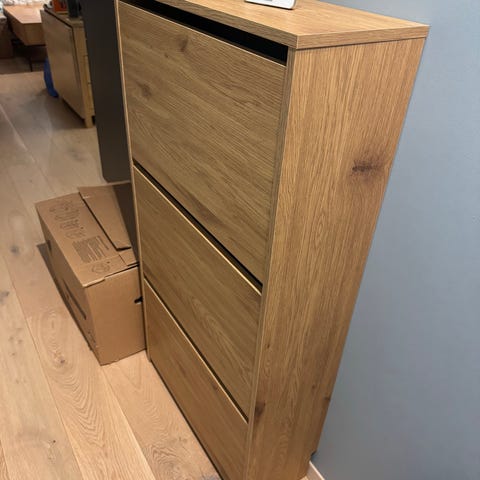 Pent brukt Tjusig skohylle fra IKEA. Det er to stk satt oppå hverandre. Ny pris er 900,-.