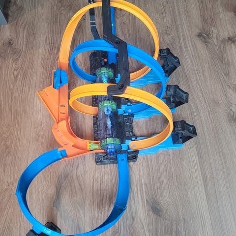 Hot Wheels bilbane med motor som gjør at bilene kan kjøre i loop. Kan bygges på til større bane. Bilbanen er veldig pent brukt. I prisen følger også med en Hot Wheels lastebil som kan strekkes ut til en liten bane og i tillegg romme mange biler.
