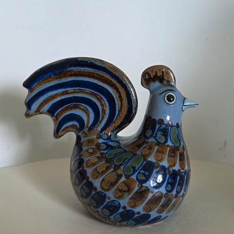 Søkeord: El Palomar, Mexico keramikk, håndlaget hane, figurfat, vintage keramikk, dekorhane, folk art, mexicansk kunsthåndverk, hanefigur, hønefigur, høne, fargerik keramikk