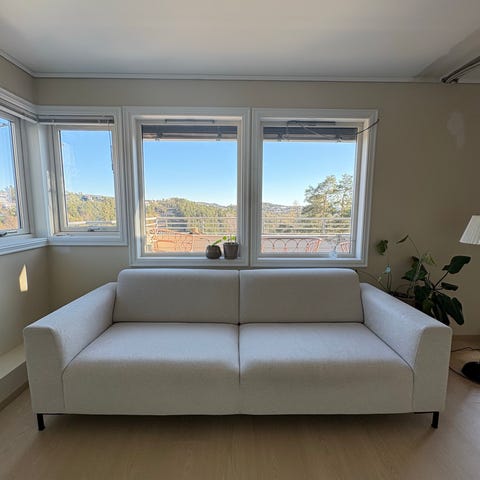 Sofaen må hentes, men vi kan være behjelpelige med bæring ut til bil etc.