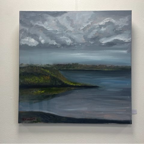 Malerier med landskap og naturmotiver. Størrelser varierer fra 80cm til 123 cm i bredde og 32cm til 80 cm i høyde. Motivene inkluderer hager, elver, skog, ender i vann og seilbåter på sjøen. Maleriene har ulike fargepaletter og detaljer som skildrer natur og vannscener.