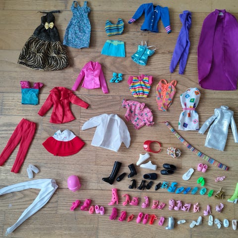 Dukke og kleslot (du velger kleslot selv). Bildene beskriver dukken og klærnes tilstand. Sjekk dermed disse bildene nøye eller kontakt meg dersom du ønsker mer informasjon. I denne annonsen er det satt sammen ulike klespakker - som tilsammen med dukken selges for 1500kr + porto. Selger kan selv velge andre kleskombinasjoner (klær fra denne eller andre av mine annonser) der samlet pris blir 1500kr.