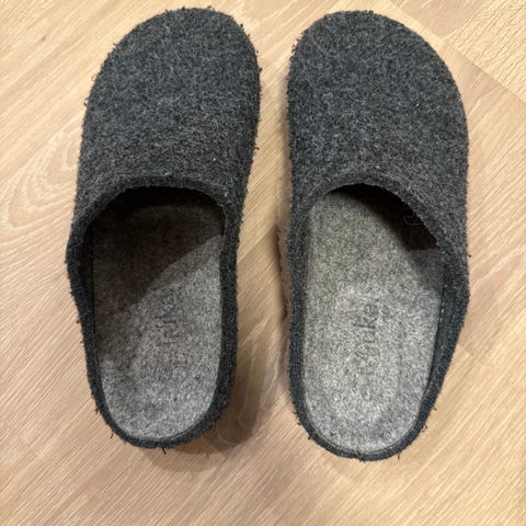 Pent brukte tøfler i 100% merinoull selges. Gode, myke og varme. Antisklisåle gjør at de ikke er glatte.
