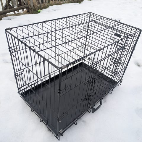 Synlig brukt, men fullt brukbart hundebur. Passer i mindre biler, pga skråveggene. Dør på to sider.