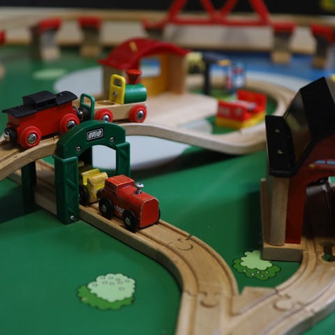 Et praktisk lekebord med togbane fast montert på bordplaten. Her er det plass til mange barn samtidig rundt bordet.