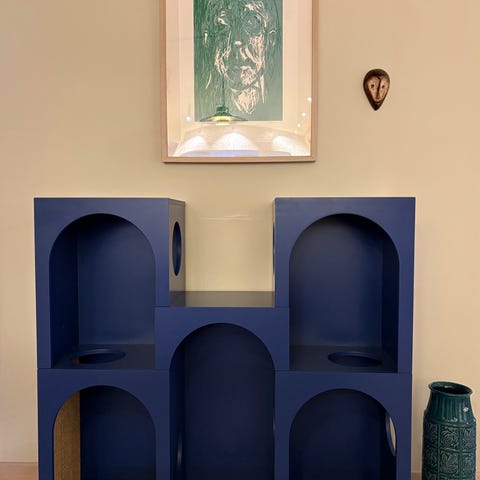 6 innvendige etasjer, 7 dersom du inkluderer toppen av kloretønna. "Hull" i hver mellomplate for at katten (-e) skal kunne klatre mellom etasjene uten at de må klatre på utsiden av stativet.