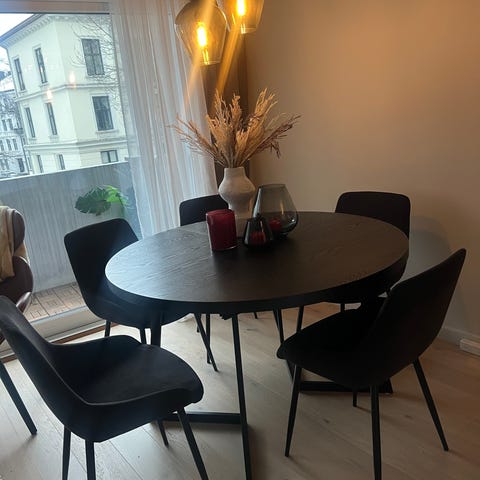 Selger 6 stk svarte Eris spisestoler, pent brukt. Varen er utgått, men er kjøpt på Bohus. Kvittering kan ettersendes.