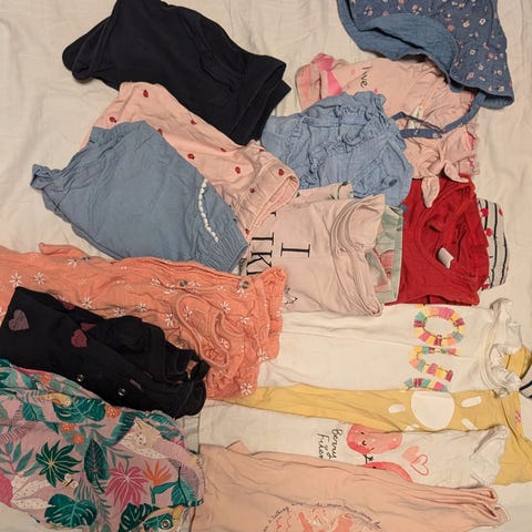 Selger en stor klespakke i strl 86. Perfekt til bhg. Flekker kan forekomme men har ikke observert noe veldig merkverdig, vet at den mørkeblå ullbodyen har et lite hull på magen men det har ikke blitt større med bruk og påvirker ikke bruken.