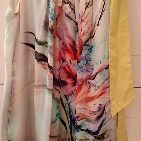 Carla festkjole i størrelse 44 laget av 100% silke. Kjolen har flerfarget mønster og er designet for kvinner. Materialet gir en lett og behagelig passform, egnet for formelle anledninger. Nydelig florlett silke.