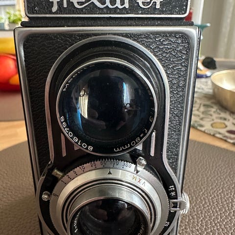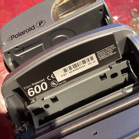 Polaroid Land Camera Polaroid Land Camera Model 80 med innebygd blits og optisk søker. Kameraet bruker Polaroid Land film og har instruksjoner på baksiden for bruk.