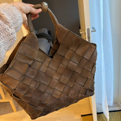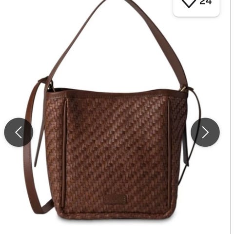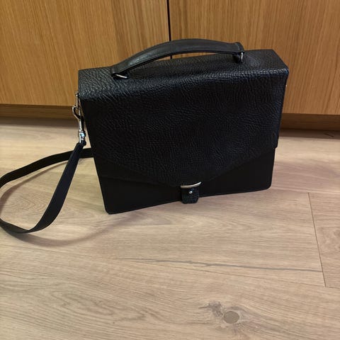 Mål 12 cm x 16 cm. Innvendig lomme, skinn på hele innsiden. Glidelås på toppen. Støvbag følger med.