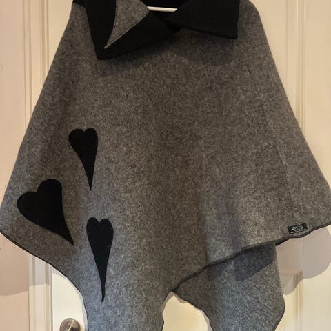 Deilig og stor poncho, hele 140 cm fra topp og ut til spissen, i 100 prosent Rauma ull. Maskinstrikket og Tovet. Deilig å krype opp i sofaen med, eller slenge på seg når man skal ut.