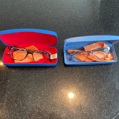 Ray-Ban briller for barn med grønn og svart ramme. Brillene leveres med etuiet og en mikrofiberklut. Rammens innside har modellnummer og mål. Noe slitasje er synlig på brillestangen.