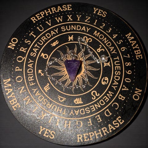 Rosenkvarts pendel og plate med bokstaver, ukedager, ja/nei svar for dypere forklaring på spørmålet og mer utfyllende svar.
