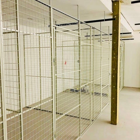 Utendørs bod grå med rød dør