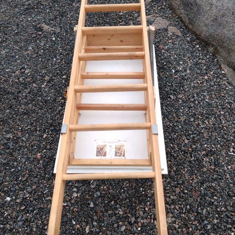 Vindeltrapp selges ved henting og demontering. Rekkeverket er hvitt med håndløper i lyst tre. Trappen har en spiralform og passer for innendørs bruk.