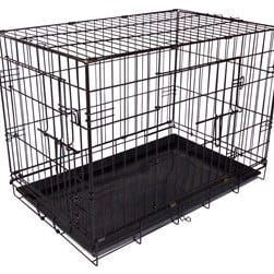 Katt og Hund Bur med metallgitter og håndtak. Bur i svart farge med dør og bunnbrett, egnet for transport eller oppbevaring av kjæledyr.