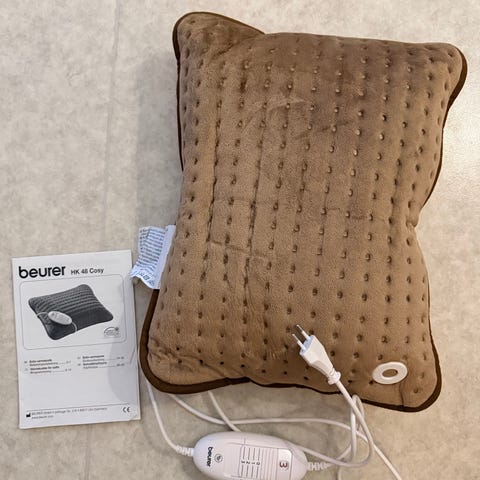 Beurer varmepute i hvit farge med rød kant. Varmeputen har en kontrollenhet for justering av varmeinnstillinger. Den er designet for personlig bruk og kan bidra til lokal oppvarming og lindring av muskelspenninger.