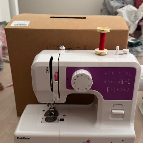 Symaskin i god stand selges. Følger med beskyttelseskasse, men hurtiglåsen på den ene siden av kassen må fikses.