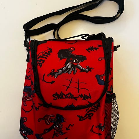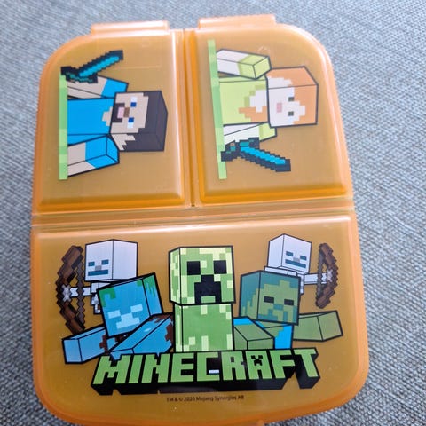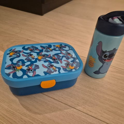 Blå matboks med skillevegg og gamingmotiv på lokket. Den er 18 cm bred og dybde er 14 cm med håndtakene. Drikkeflasken er svart med blå kork og har teksten PlayStation på begge sider. Den er 23 cm høy.