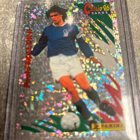 Panini Italia 90 fotballkort med bilde av Paolo Maldini. Kortet har nummer 46 og er produsert av Edizioni Panini S.p.A. i Modena, Italia. Kortet er en del av samlingen fra VM i fotball 1990.