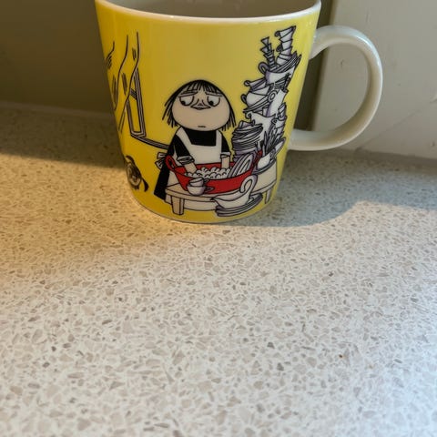 Arabia Mummi krus i porselen med svart-hvitt mønster og detaljer i farger. Kruset har hank og er egnet for servering av varme drikker.