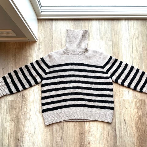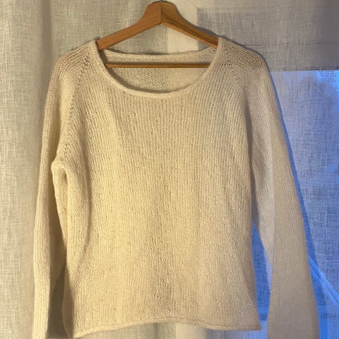 Jenny sweater fra PetiteKnit str S/M selges og er strikket i en tråd Sunday fra Sandnes garn og en tråd Alva fra Filcolana. Genseren er ny og ubrukt og kommer fra er røyk og dyrefritt hjem.