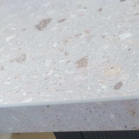 Dette er et svært holdbart materiale som tåler høye temperaturer og er motstandsdyktig mot flekker og riper. Materialet er likevel ikke helt varmebestandig, og riper kan forekomme. Vi anbefaler derfor alltid å bruke bordbeskyttelse under varme gryter og panner, samt skjærebrett ved bruk av kniver.