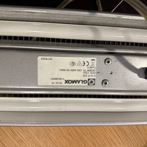 LED skrivebordslampe med justerbar arm. Lampen har en lang, rektangulær LED-lyskilde og en solid base for stabilitet. Designet for bruk på arbeidsbord eller skrivebord, egnet for oppgavelys.
