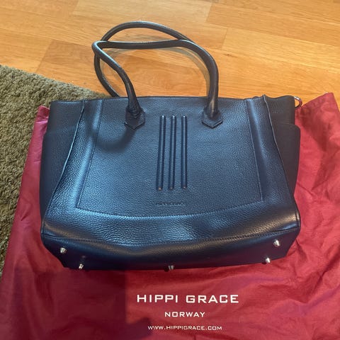 Skinn og semsket skinn. Modellen heter Geneve. En god og romslig veske med plass til dokumenter, pc (15 tommers), etc. Lengde 36 cm (målt i bunnen)/40 cm (på toppen), høyde 27 cm og dybde 13 cm. Flere mindre rom inni vesken, inkludert lomme til mobil. Utvendig glidelåslomme. Skulderreim og støvpose følger med.