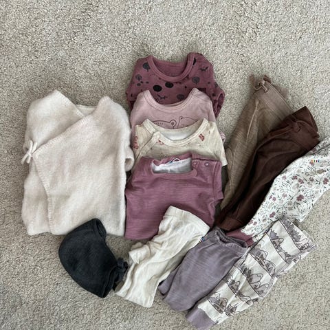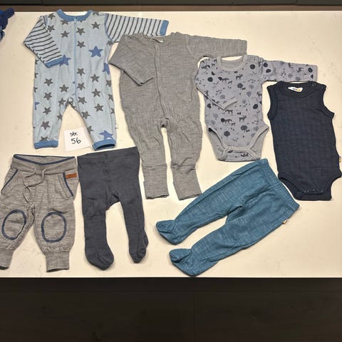 Pent brukt klespakke med ull i størrelse 56 + en body i 62. Totalt 10 plagg. Noen nupper kan forekomme på blant annet strømpebuksa, disse er ikke forsøkt fjernet. Pakken inneholder: