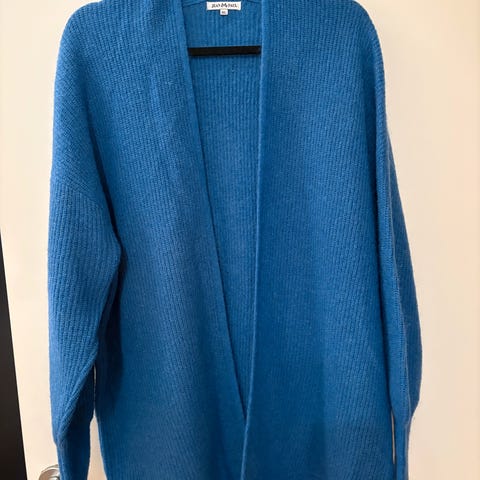 Mørkeblå cardigan fra Jean Paul i ull og bomull. Satt den under godt brukt da det er litt nupper under/ ermene. Disse kan sikkert fjernes. Str XL