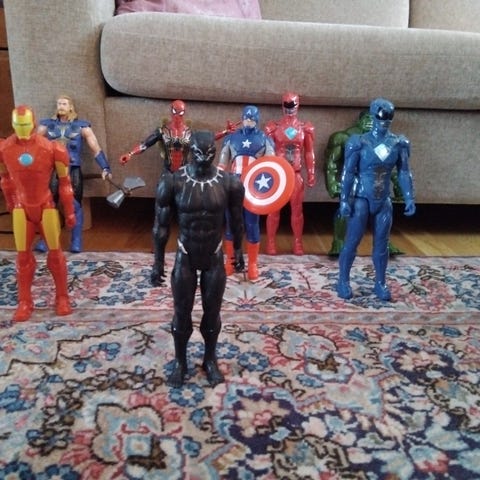 Marvel actionfigurer i ulike modeller og størrelser. Figurenes farger og design varierer, inkludert karakterer som Hulk, Spider-Man, Iron Man, og andre superhelter. Passer for samling og lek.