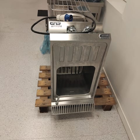 kjøledisk laget i rustfritt stål. Egnet for kommersiell bruk med flere dører og arbeidsflate på toppen. Designet for kjøling og oppbevaring av matvarer i profesjonelle kjøkkenmiljøer.